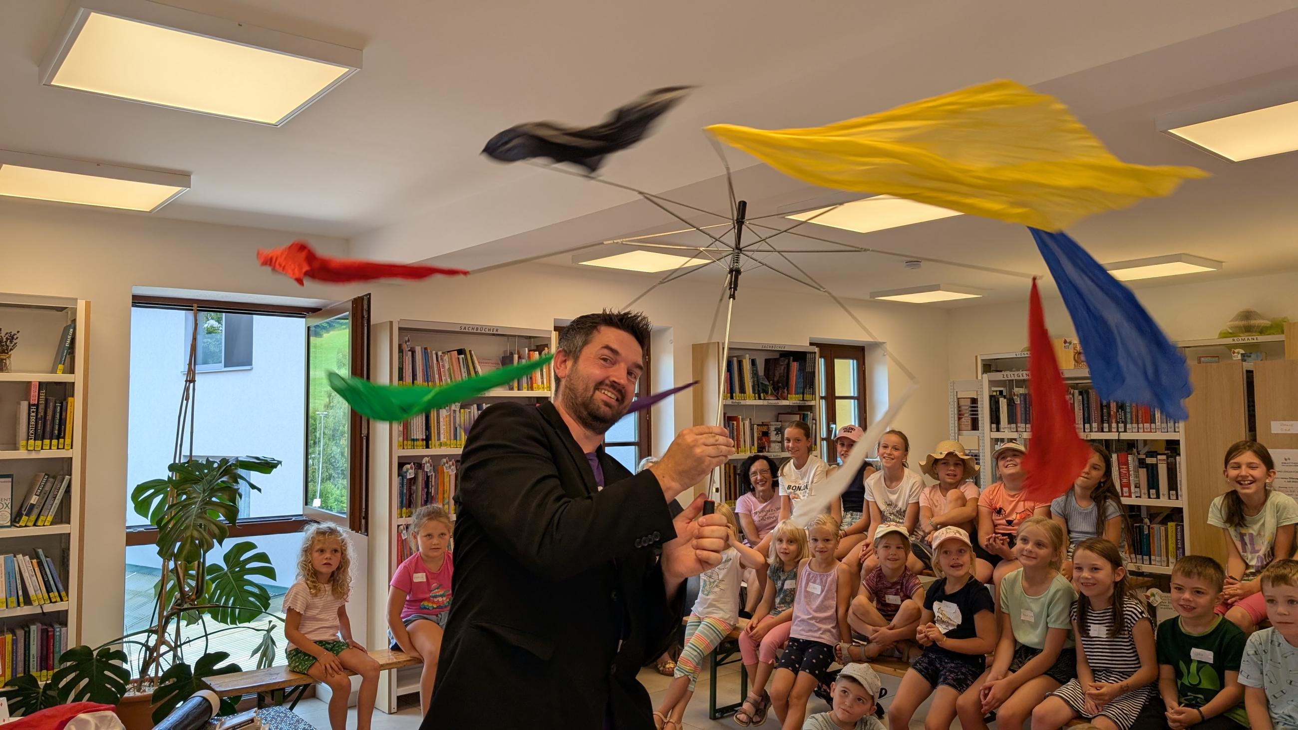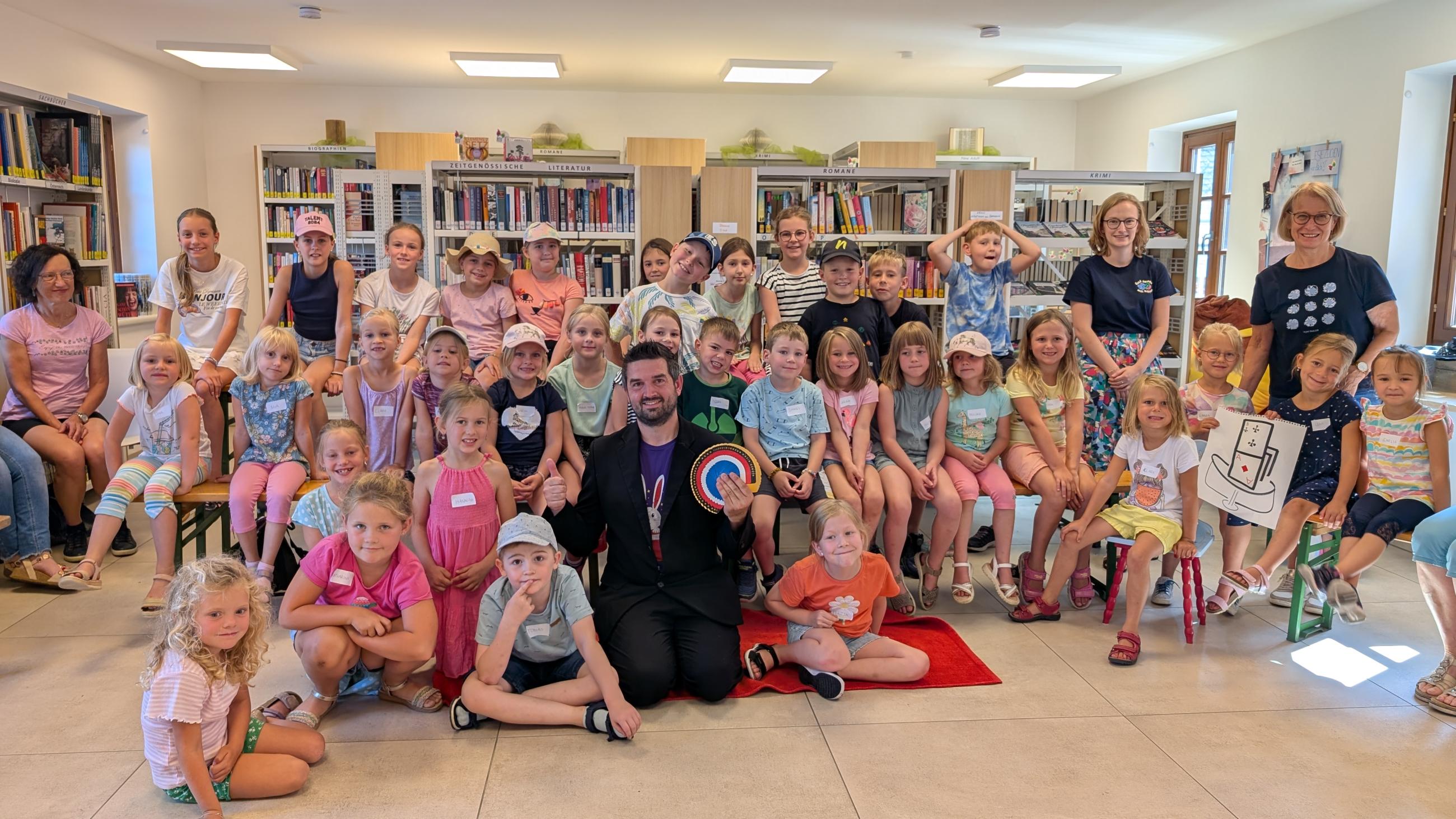 35 Kinder folgten unserer Einladung und sie waren von den verblüffenden Tricks des Zauberers Lukas begeistert. Ein abwechslungsreiches Rahmenprogramm mit Geschichten, Basteleien und einer Schnitzjagd und eine Jause zum Abschluss sorgten für erlebnisreiche Stunden in der Bibliothek.