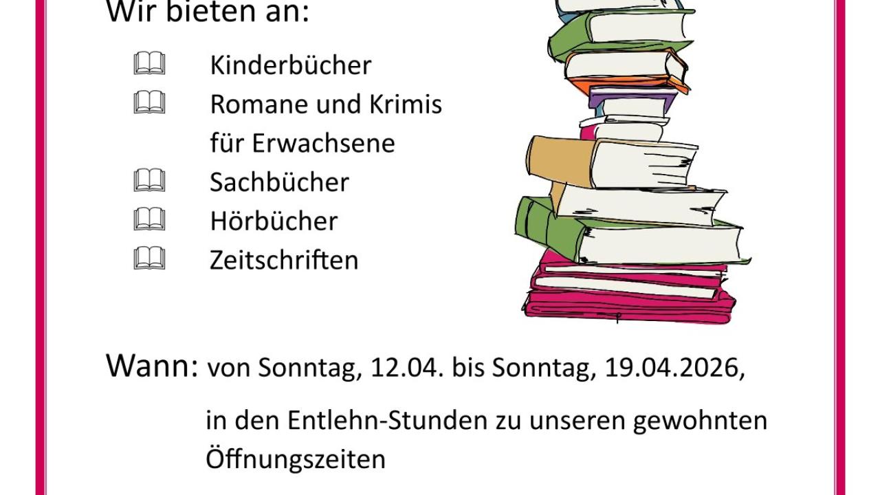 12.04.2026 - 19.04.2026 Flohmarkt in der Bibliothek Gut erhaltene Kinderbücher, Sachbücher, Krimis, Romane und Hörbücher zum Mitnehmen!